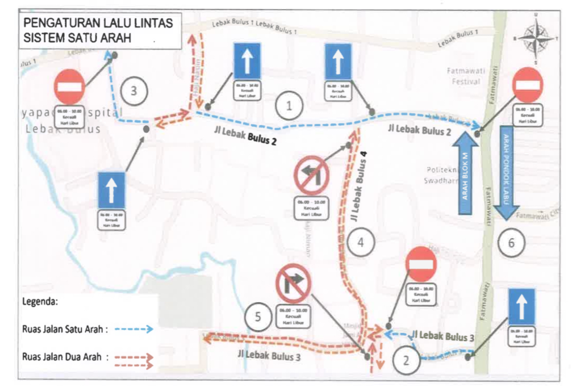 Arah lalu lintas yang sebelumnya satu arah menuju simpang Fatmawati, diubah menjadi satu arah dari simpang Jalan Lebak Bulus IV ke simpang Haji Nasiin.
