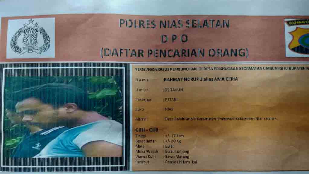 Sementara, dari data yang dibagikan pihak Polres Nisel kepada sejumlah Wartawan dalam bentuk kertas HVS F4, tentang identitas dan ciri-ciri tersangka Rahmat Ndruru yaitu, nama, Rahmat Ndruru Alias Ama Ceria, umur 35 Tahun, pekerjaan Tani, Suku Nias, Alamat Desa Balohilimola, Kecamatan Umbunasi, Kabupaten Nias Selatan.