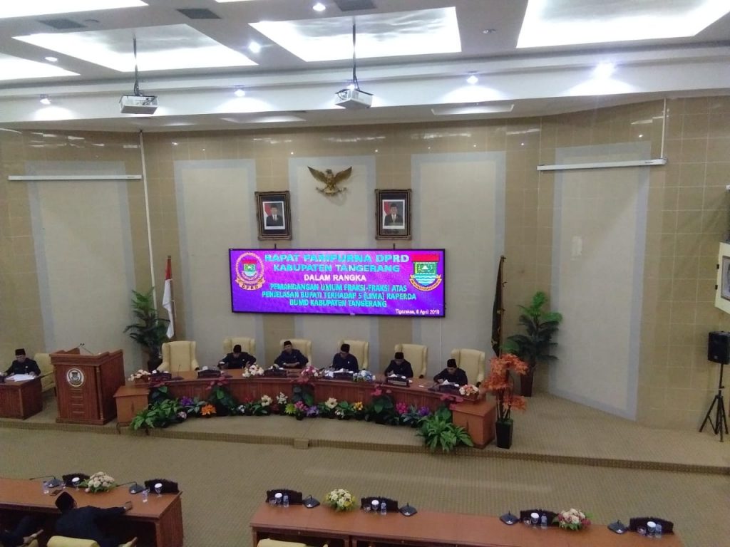 Kabupaten Tangerang – DPRD Kabupaten Tangerang menggelar rapat paripurna tentang pandangan umum fraksi atas penjelasan bupati Tangerang terhadap 5 Raperda Badan Usaha Milik Desa (BUMD), Senin (8/4/2019).