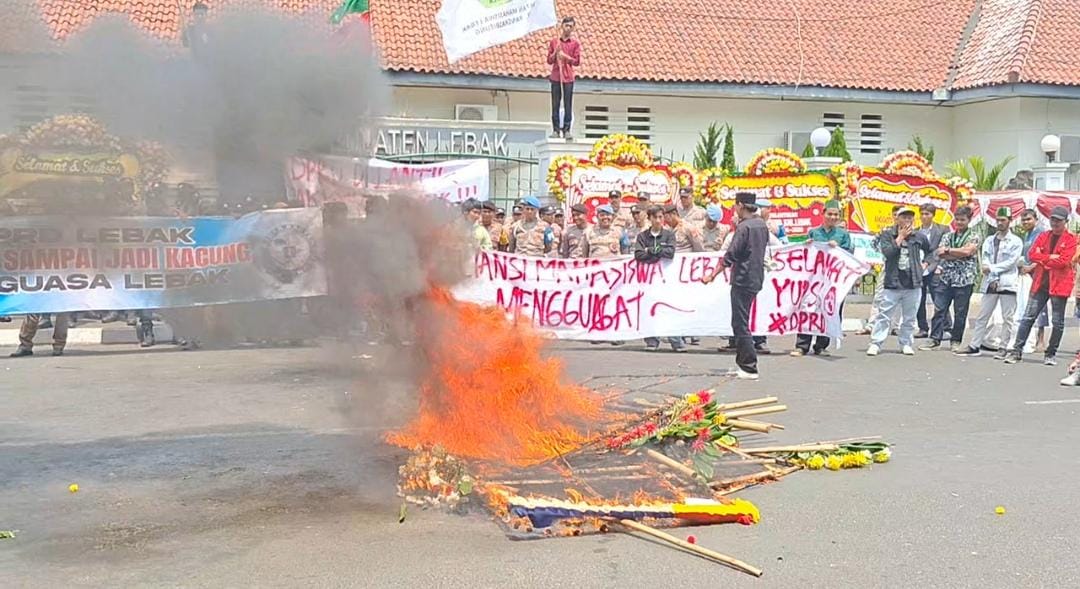 Pelantikan Anggota DPRD Lebak Diwarnai Unjuk Rasa, Massa Bakar Ban dan Karangan Bunga