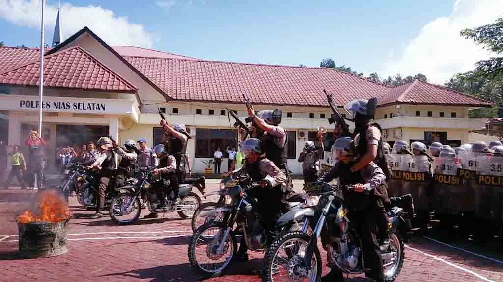 Polres Nias Selatan menggelar simulasi Sistem Pengamanan (Sispam) Kota, Penanggulangan Konflik Sosial di lapangan Mabes Polres Nias Selatan, Sabtu (29/4/2017). Kegiatan ini sepenuhnya merupakan program Kapolri untuk meningkatkan pelayanan publik.