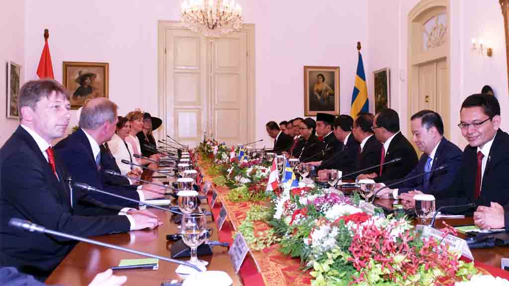“Saya senang kunjungan Sri Baginda turut melibatkan delegasi bisnis yang ternama dan cukup besar sekitar 35 perusahaan,” kata Presiden Jokowi saat memberikan pengantar pada pertemuan bilateral delegasi Pemerintah Republik Indonesia dan delegasi Pemerintah Kerajaan Swedia, di Istana Bogor, Jawa Barat, Senin (22/5/2017) siang.