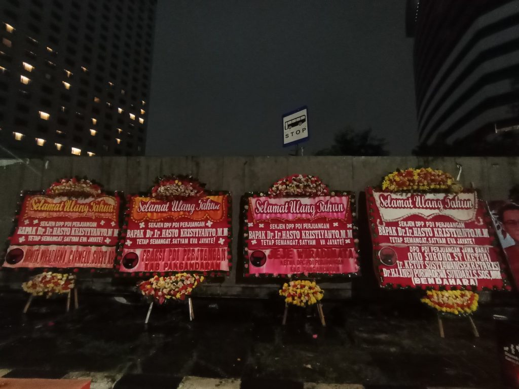 Masing-masing karangan bunga tersebut berlatar merah khas PDI Perjuangan, dengan bertuliskan ucapan: “Selamat Ulang Tahun Sekjen Dr. Ir. Hasto Kristiyanto, M.M. Tetap Semangat, Satyam Eva Jayate.”