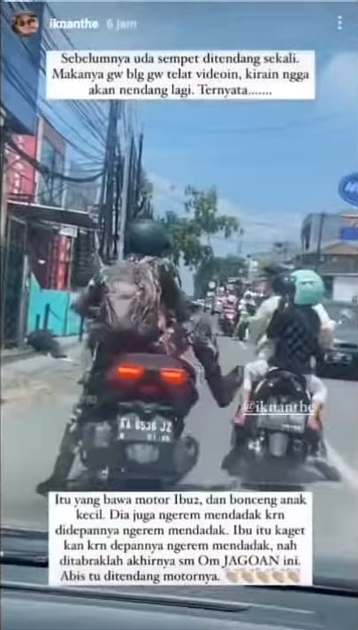 Belakangan diketahui, insiden tersebut terjadi lantaran si Ibu memberhentikan kendaraannya secara mendadak.
