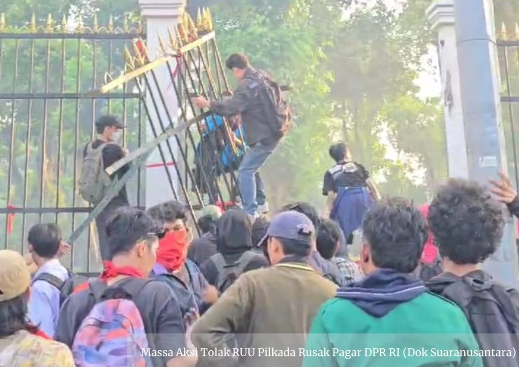 Suaranusantara.com – Massa aksi demontransi yang menolak pengesahan Revisi UU Pilkada di depan Gedung DPR RI, Senayan, Jakarta, Kamis (22/8/2024), melakukan pengrusakan pada pagar depan pintu DPR RI.