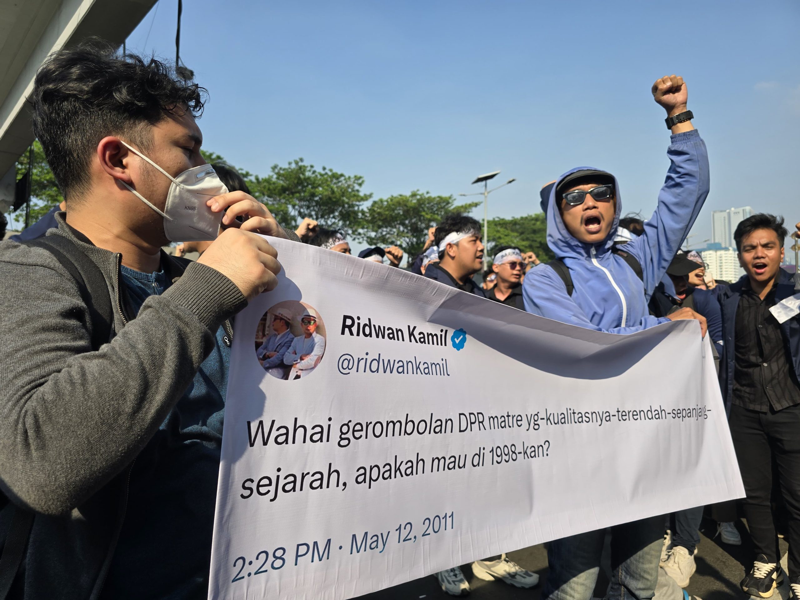 “Wahai gerombolan DPR matre yg-kualitasnya-terendah-sepanjang-sejarah, apakah mau di 1998-kan?” tulisnya, seperti terlihat banner para massa aksi, Kamis (22/8/2024).