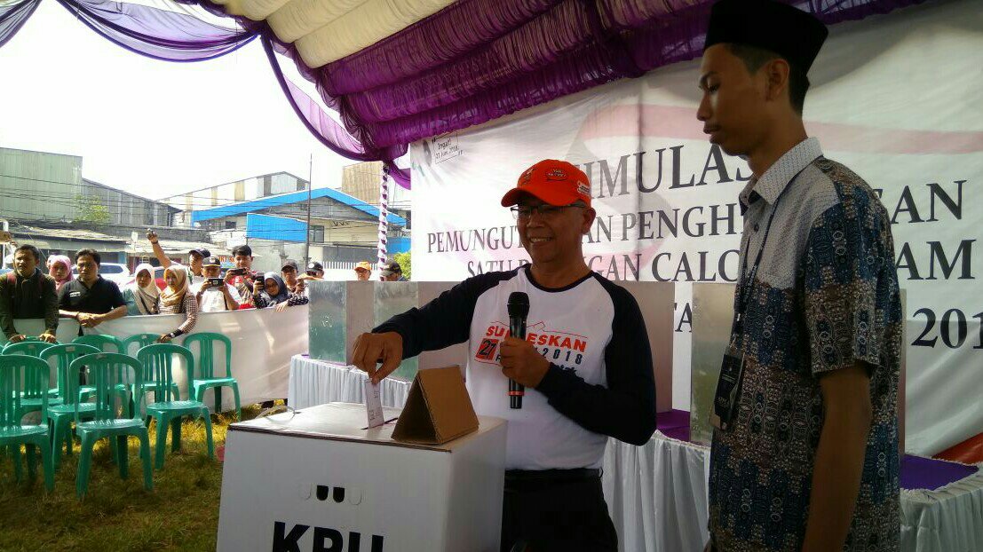Kota Tangerang – Komisi Pemilihan Umum Republik Indonesia (KPU RI) menggelar simulasi Pemilihan Kepala Daerah (Pilkada) serentak di Lapangan Gandasari, Jalan Pajajaran, RT 002/04, Kecamatan Jatiuwung, Kota Tangerang, Provinsi Banten, Sabtu (12/5/2018).