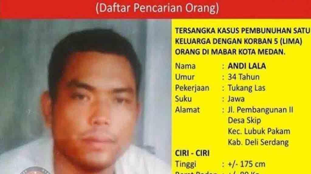 Andi Matala alias Andi Lala (34), yang diduga menjadi otak pelaku pembunuhan sekeluarga di Jalan Mangaan Gang Benteng, Lingkungan XI, Kelurahan Mabar, Kecamatan Medan Deli, setelah seminggu diburu, akhirnya berhasil dibekuk petugas.